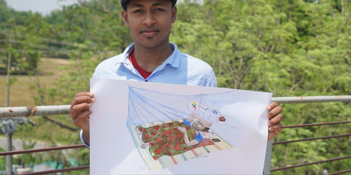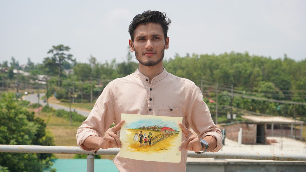 For Enayet Khan, art became a way to cope when words failed him. He describes his turning point after arriving in the camps, “after 2017, when we fled from our country, I couldn’t find peace. I felt restless. I didn’t feel like sitting anywhere. Then I thought, I have a talent. I started drawing. At first, I didn’t know what to draw. But then I thought, the world has not seen what we went through. So I began to draw those stories.”