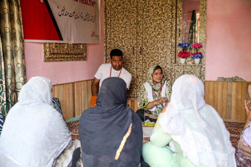 Rayees Ahmed Mir and Taheem Jaffar, MSF community mental health workers starts the session by asking the women what they know about mental health. Initially, the responses are hesitant.