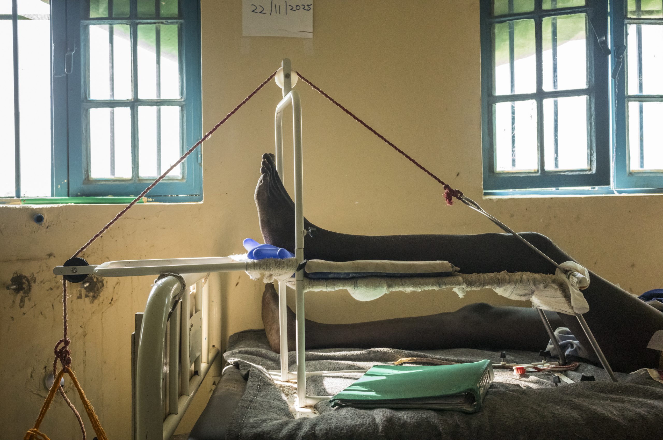 - A patient rests in skeletal traction inside the MSF hospital in Abyei, where the wards have filled with people escaping the fighting in Darfur and the Kordofan states. Many arrive with fractures from gunfire, beatings or the chaos of their flight — injuries that go untreated for days until they reach this contested strip of land between Sudan and South Sudan. Abyei’s status has remained unresolved for more than a decade, yet it has become a fragile point of passage for those pushed out by war, a place where the simplest medical care can mean the difference between recovery and lifelong disability. ©Nicolò Filippo Rosso