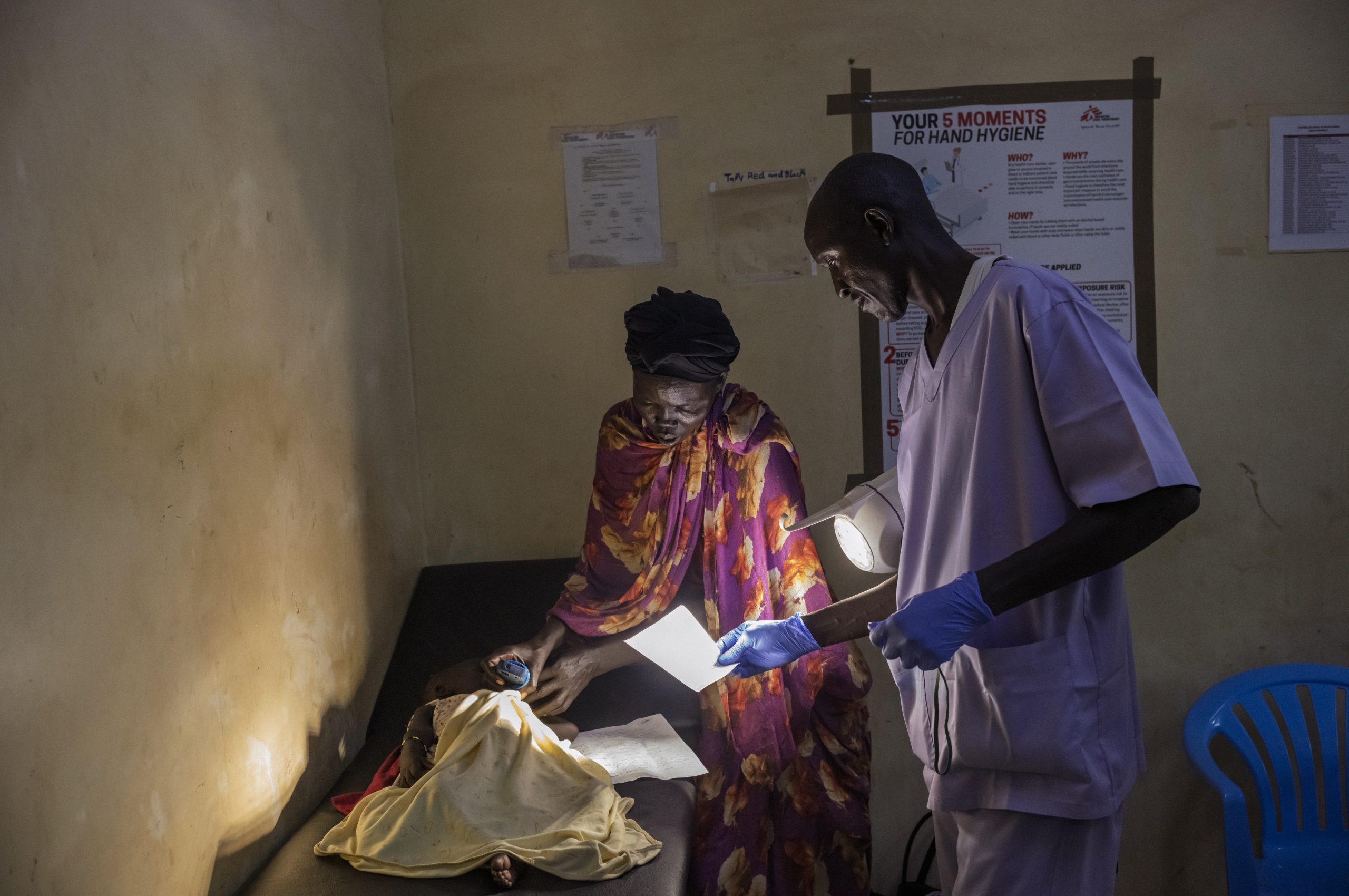 - Abyei, South Sudan — In a consultation room, an MSF nurse examines Thiany Chol under a focused lamp, using the light to locate a viable vein for intravenous hydration. After weeks of displacement and nutritional stress, many children arrive severely dehydrated, febrile, or anemic, requiring urgent stabilisation. For Yan Maper, who fled the conflict in Sudan with her daughter, this careful clinical procedure represents the first step toward restoring her child’s strength after a long period without reliable medical care. ©Nicolò Filippo Rosso