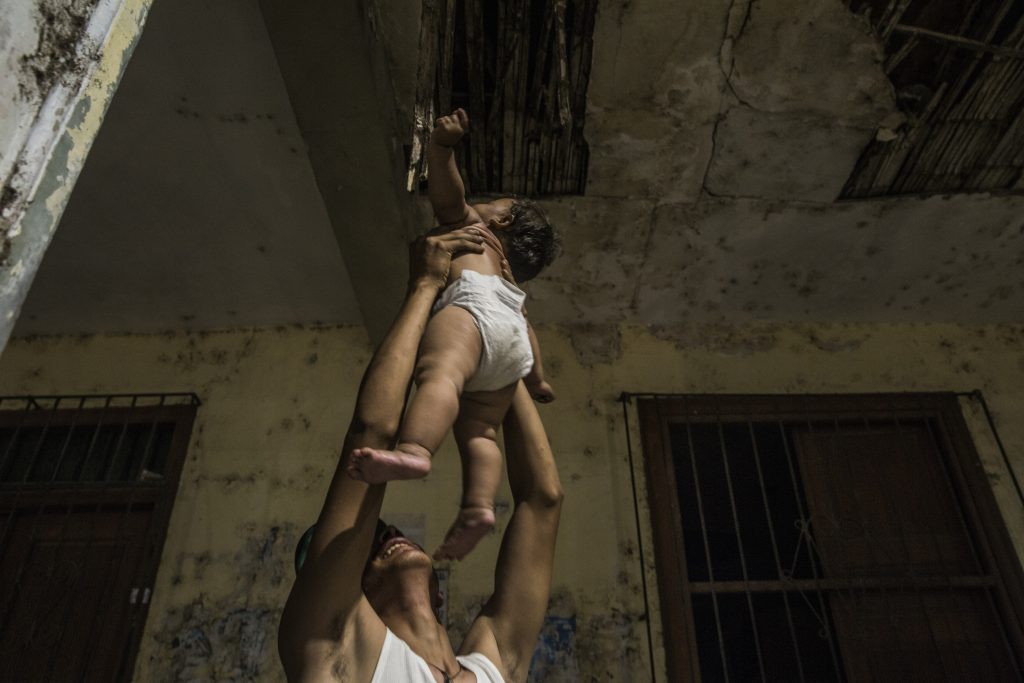 - A Venezuelan migrant lifts up his one-year-old daughter shortly before going to sleep on the sidewalk in the central square of Tumbes. Like other newly arrived Venezuelan migrants, they sleep outdoors because they do not have enough money to pay for lodging. ©MAX CABELLO ORCASITAS