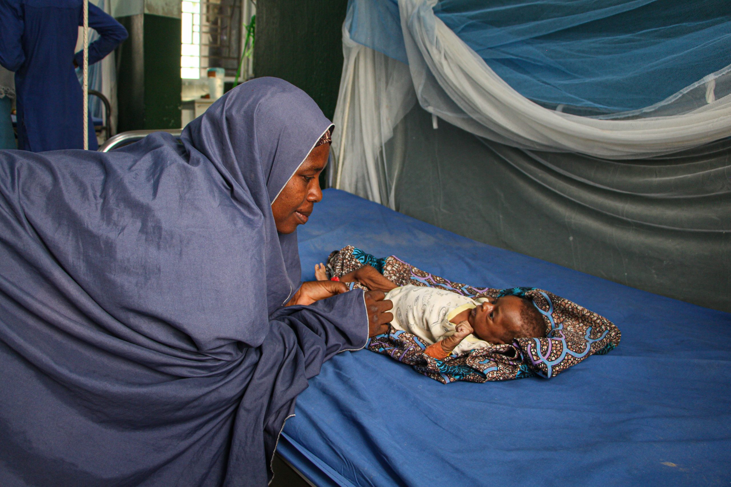 - Zulfa’u Musa bends looking at her daughter Safiya at the ITFC in General Hospital Zurmi, Zamfara state, Northwest Nigeria.