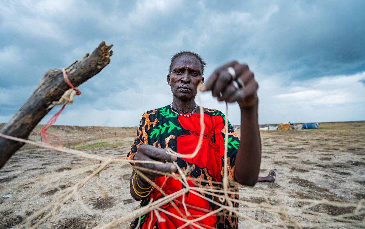 - Veronika Nyabol Knom, 39 years old, fencing off her plot of land to prevent goats from eating the seeds she has just planted. Internally Displaced Camp population (IPD) camp, Bentiu, Unity State, Rubkona County, South Sudan. Isaac Buay/MSF