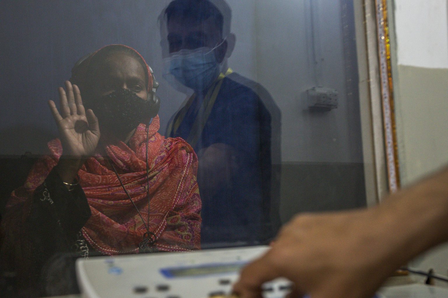 - Rihana, a 28-year-old patient participating in the endTB-Q clinical trial, sits for an audiometric examination in a soundproof booth to verify her hearing capacity during a routine consultation at the endTB clinic run by Interactive Research & Development (IRD) in Kotri, Pakistan. The trial aims to test a short treatment for a very hard-to-treat form of multidrug-resistant tuberculosis -an airborne infectious disease that has grown resistant to standard medications: pre-extensively drug-resistant TB (pre-XDR-TB). endTB is a 7-year partnership among Partners In Health (PIH), Médecins Sans Frontières (MSF), Interactive Research & Development (IRD). ©Asim Hafeez