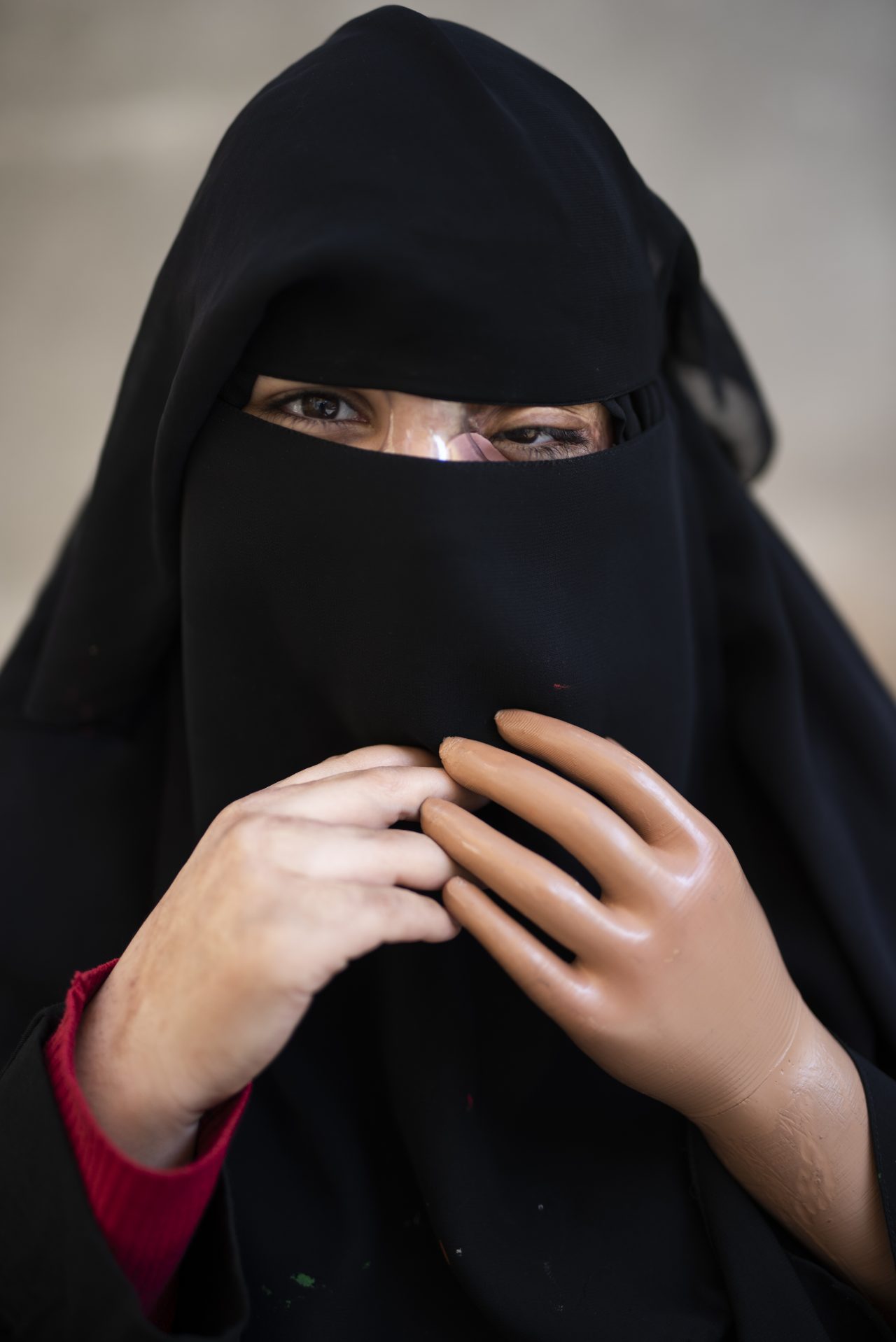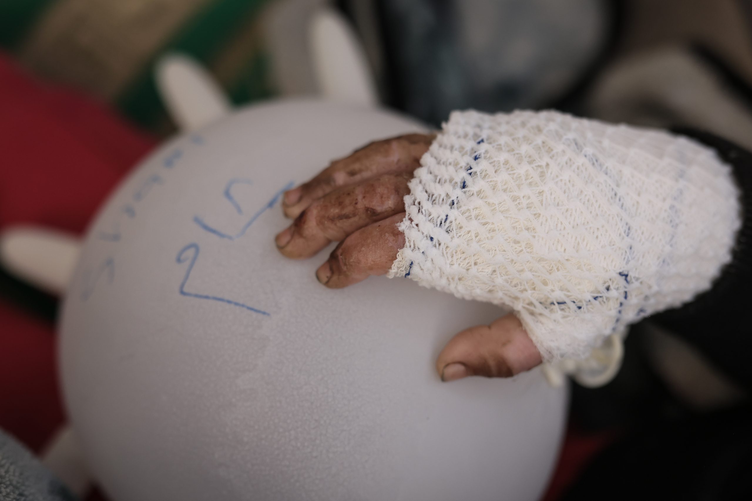 - Aisha (14), Yemen. Aisha was 6 months old when a candle fell onto the mattress where she was sleeping. Her family assumed she was dead until they heard her cries. Since 2015, over 13 power stations have been damaged across Yemen due to war, leading many families to depend on candlelight. Aisha received injuries to her head, face, and hands, which resulted in limb amputation and years-long treatment. She has been treated in several stages at the MSF hospital in Amman. Aisha is an artist: she draws, knits, and makes accessories. The first time I met Aisha, she was wearing a Yemeni dress splattered with paint. We were at the hospital’s art school with Mais, a mental health counsellor. MSF hospital, Amman, Jordan. May 2024. ©Rehab Eldalil/MSF