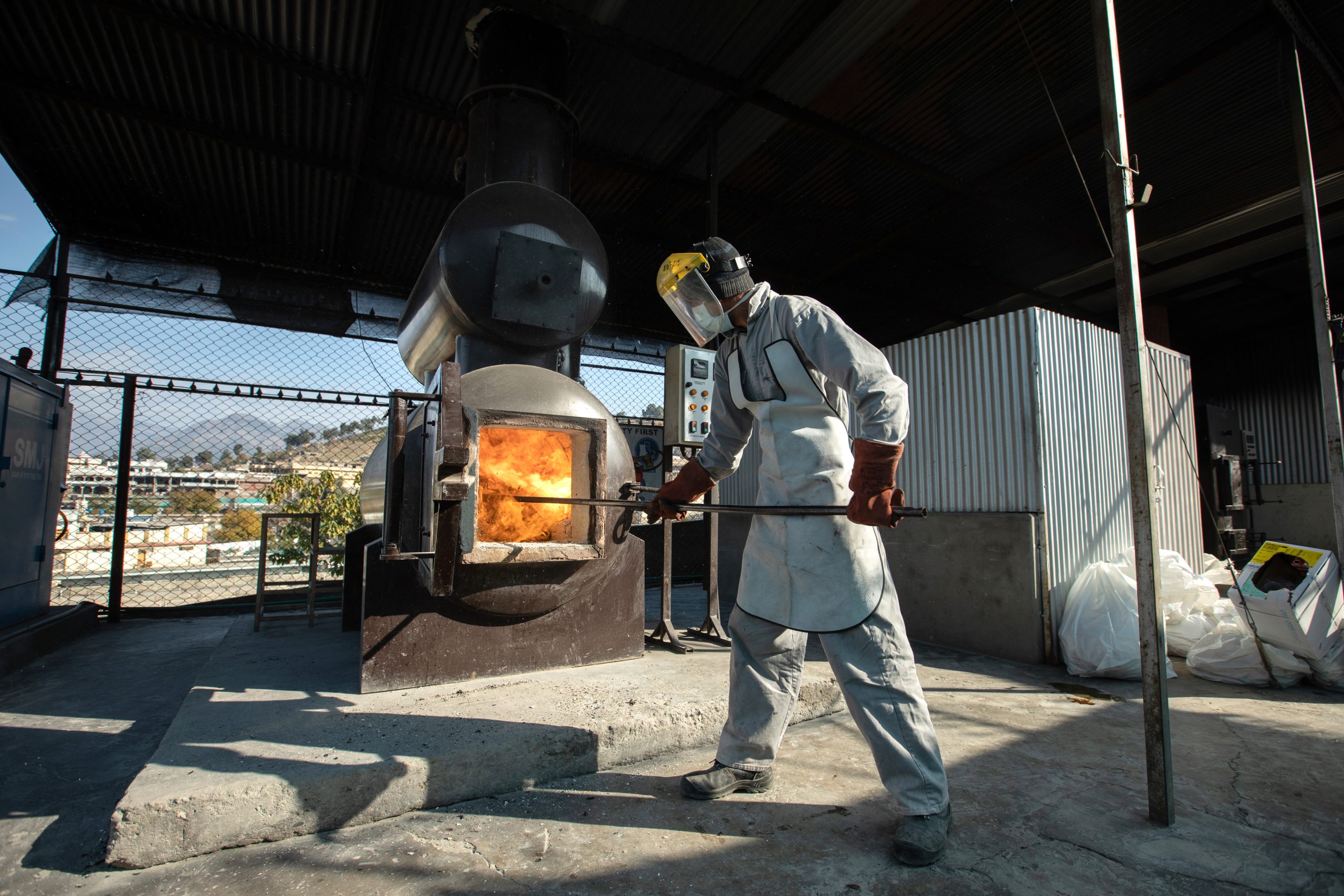 - Zia-ur-Rehman, Head of Sanitation and Labour for MSF in Timergara, shovels the waste that was collected from various departments of the DHQ hospital in the incinerator on the 6th of December, 2020. ©Khaula Jamil