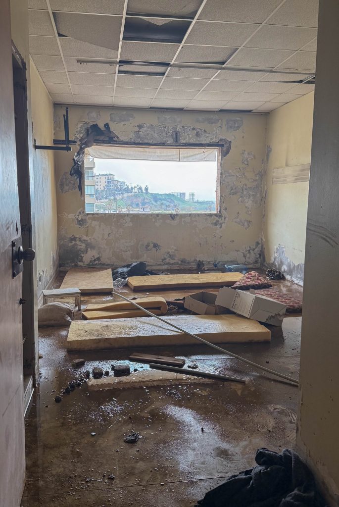 My colleague, Mohammad Dandash, MSF logistics manager, walks me through the 12-storey building. MSF worked here during the 2024 escalation, clearing grey water and repairing toilets for people with disability or additional needs. Following the ceasefire, families returned home.