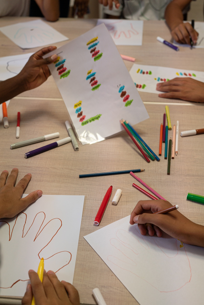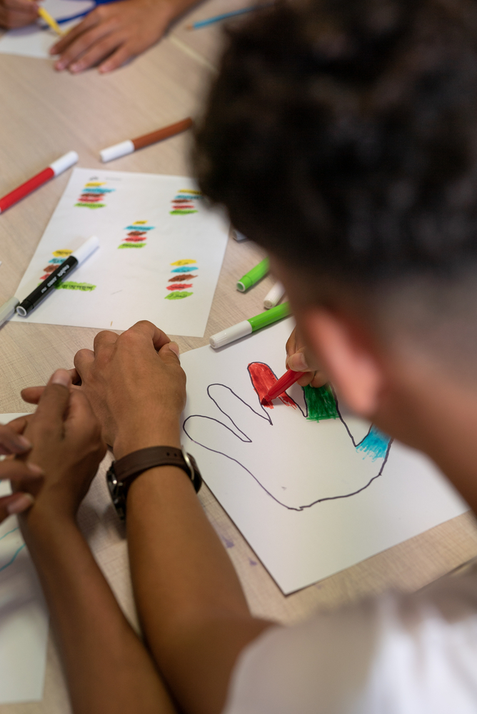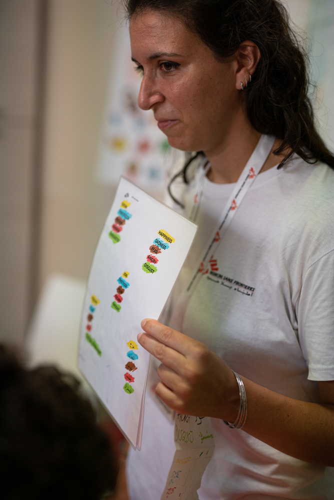 The MSF teams in Agrigento run psycho-educational workshops with migrant minors to help them from a psychological point of view: through colours, the young people can express the emotions they feel, learning to recognise and represent them. Each colour represents a different emotion, and the children colour their hands according to how they feel. Many of them often express their happiness at having survived the difficult journey, but also their fear of being separated from their travelling companions, of not finding work and of not being able to support their families.